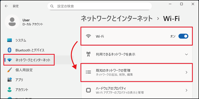 [ネットワークとインターネット] - [Wi-Fi] をクリックし、[既知のネットワークの管理] をクリックします。
