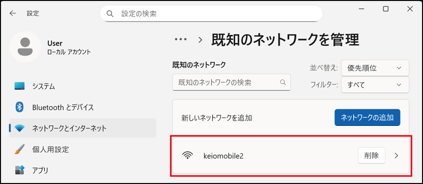 [ネットワークとインターネット] - [Wi-Fi] をクリックし、keiomobile2 が [接続済み] と表示されている事を確認してください。