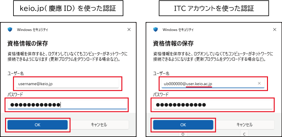 ITCアカウントの場合は、"あなたのITC アカウント@user.keio.ac.jp" と "ITCアカウントでの Wi-Fi 接続パスワード" を入力します。