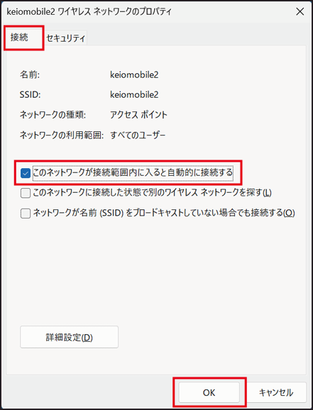 [接続] タブを選択し [このネットワークが接続範囲に入ると自動的に接続する] にチェックを入れ [OK] をクリックします。